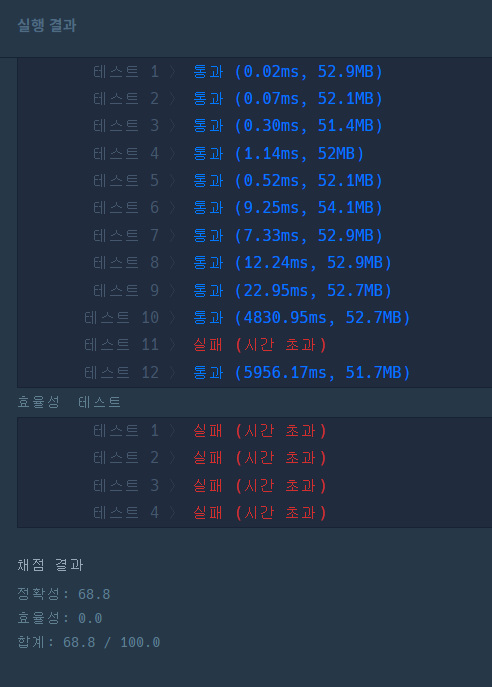 | 흔히 알고있는 소수찾기 알고리즘(이중포문 사용)을 써보았으나 큰 수의 경우에서 시간초과가 되었고, 효율성 검사가 0점으로 나왔다. => 시간복잡도 O(n) |