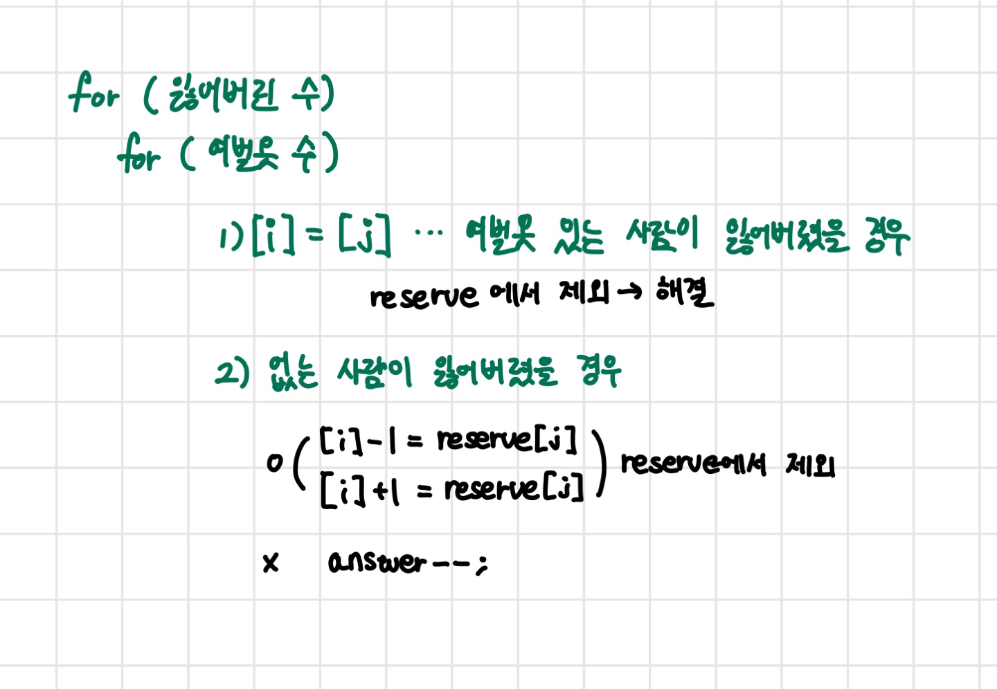 reserve를 그대로 복사한 ArrayList를 만들고, 체육복은 우선 모두가 입을 수 있다고 가정한다. 1) 여벌옷이 없는 학생이 도난당했을 때, 앞뒤번호가 여벌옷이 없을 때(List에 존재하지 않을 때) 체육복을 입을 수 없기에 answer--를 진행한다. 만약 앞뒤번호 둘 중 하나라도 있다면, 해당 번호를 List에서 제외하여 여벌옷을 가진 명단에서 뺀다. 2) 여벌옷이 있는 학생이 도난당했을 때, 학생의 번호를 List에서 제외하여 여벌옷을 가진 명단에서 뺀다. |
