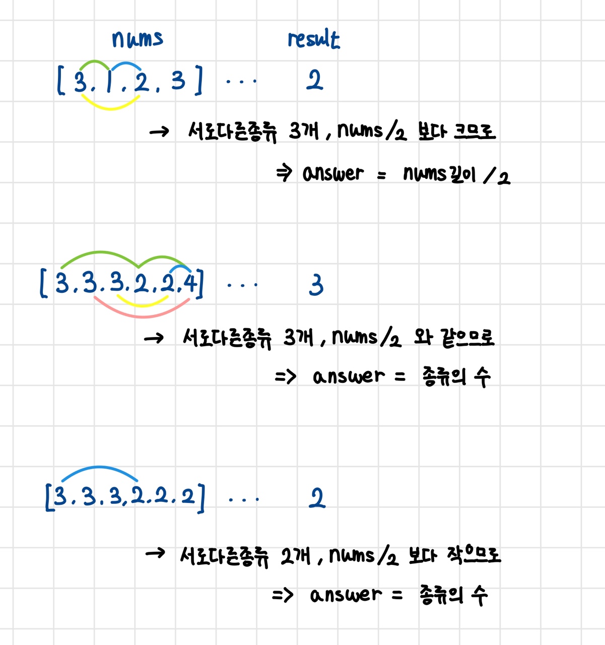 당신은 최대한 다양한 종류의 폰켓몬을 가지길 원하기 때문에, 최대한 많은 종류의 폰켓몬을 포함해서 N/2마리를 선택하려 합니다. N마리 폰켓몬의 종류 번호가 담긴 배열 nums가 매개변수로 주어질 때, N/2마리의 폰켓몬을 선택하는 방법 중, 가장 많은 종류의 폰켓몬을 선택하는 방법을 찾아, 그때의 폰켓몬 종류 번호의 개수를 return 하도록 solution 함수를 완성해주세요.