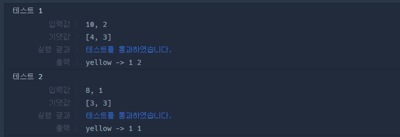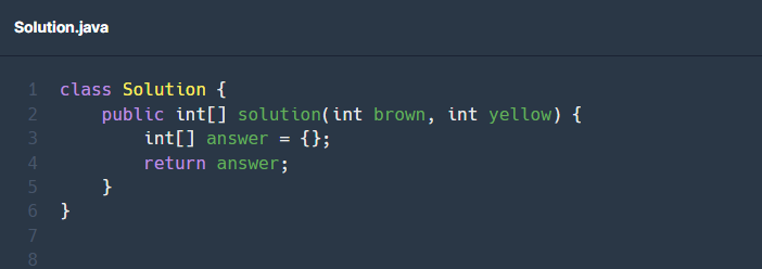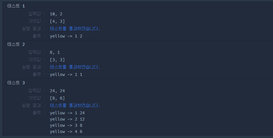 Leo가 본 카펫에서 갈색 격자의 수 brown, 노란색 격자의 수 yellow가 매개변수로 주어질 때 카펫의 가로, 세로 크기를 순서대로 배열에 담아 return 하도록 solution 함수를 작성해주세요.