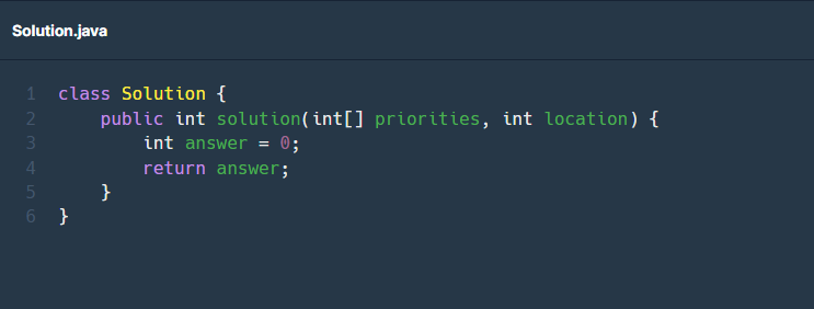 - location은 0 이상 (현재 대기목록에 있는 작업 수 - 1) 이하의 값을 가지며 대기목록의 가장 앞에 있으면 0, 두 번째에 있으면 1로 표현합니다.